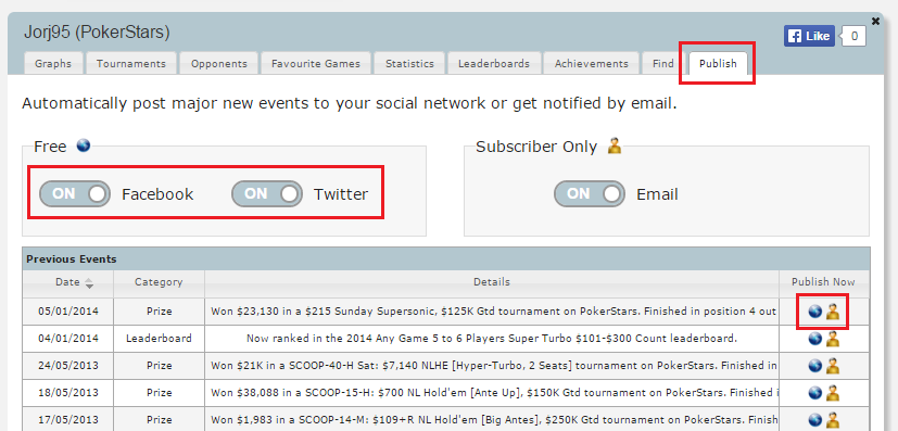Система автоматической публикации позволяет Вам автоматически или вручную публиковать информацию о Ваших важных событиях: значительных выигрышах, достижениях и рангах в таблицах лидеров в Ваши социальные медиа, а также получать email-оповещения.